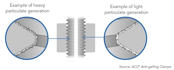 Material is worn away during on/off cycles. If this is not cleaned correctly, it will increase the chances of galling – see diagram.