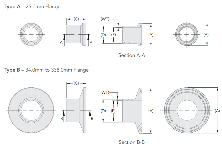 Pharmaceutical Ferrule (DN100) | DIN 32676 Table B (Long) | Length 48mm | 316L (0.8 Ra)